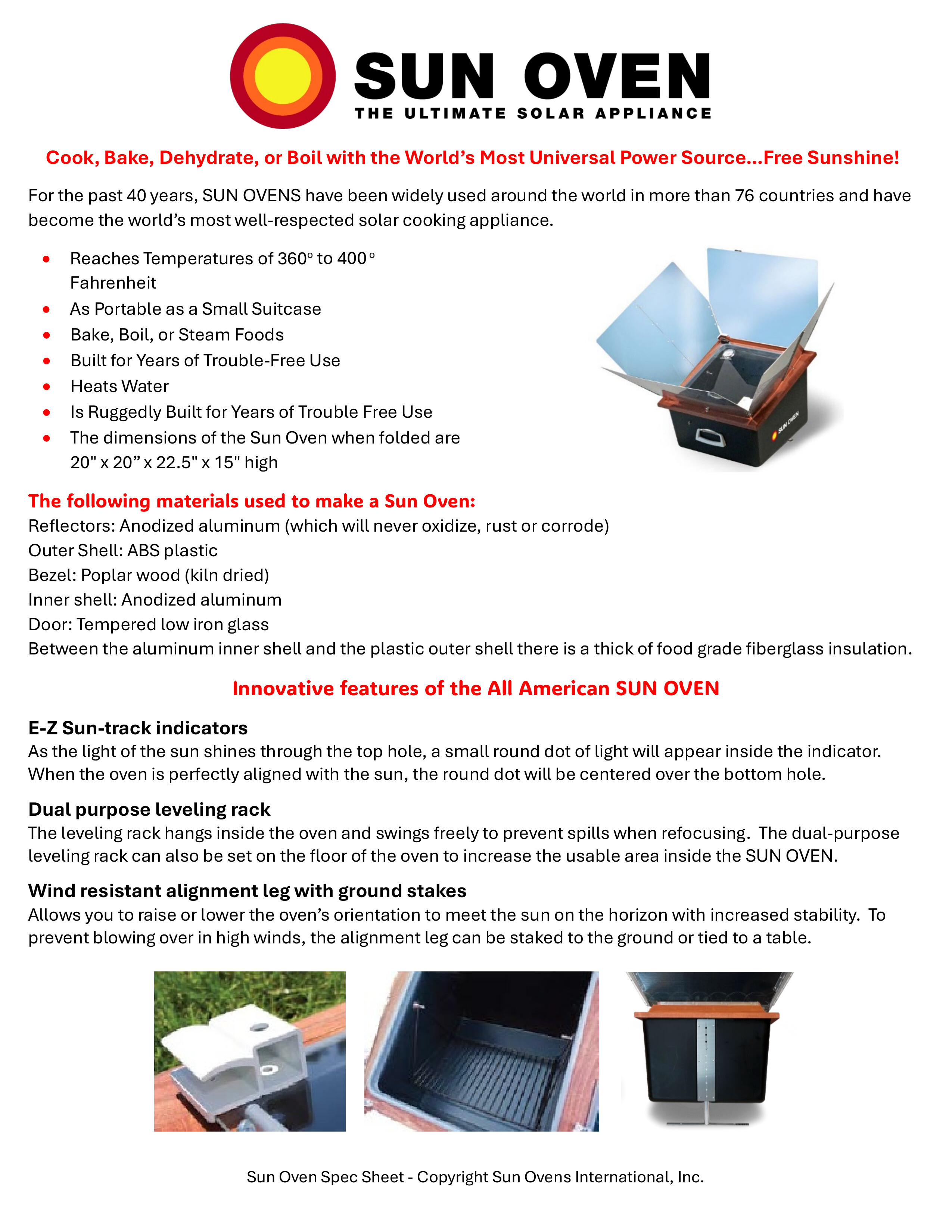 The All-American Sun Oven lets you prepare delicious meals anywhere using only sunlight. Built by hand in the USA, this durable solar cooker reaches temperatures up to 400°F and is ideal for baking, boiling, slow cooking, or dehydrating food. It’s perfect for home use, camping, hunting trips, or emergency preparedness.